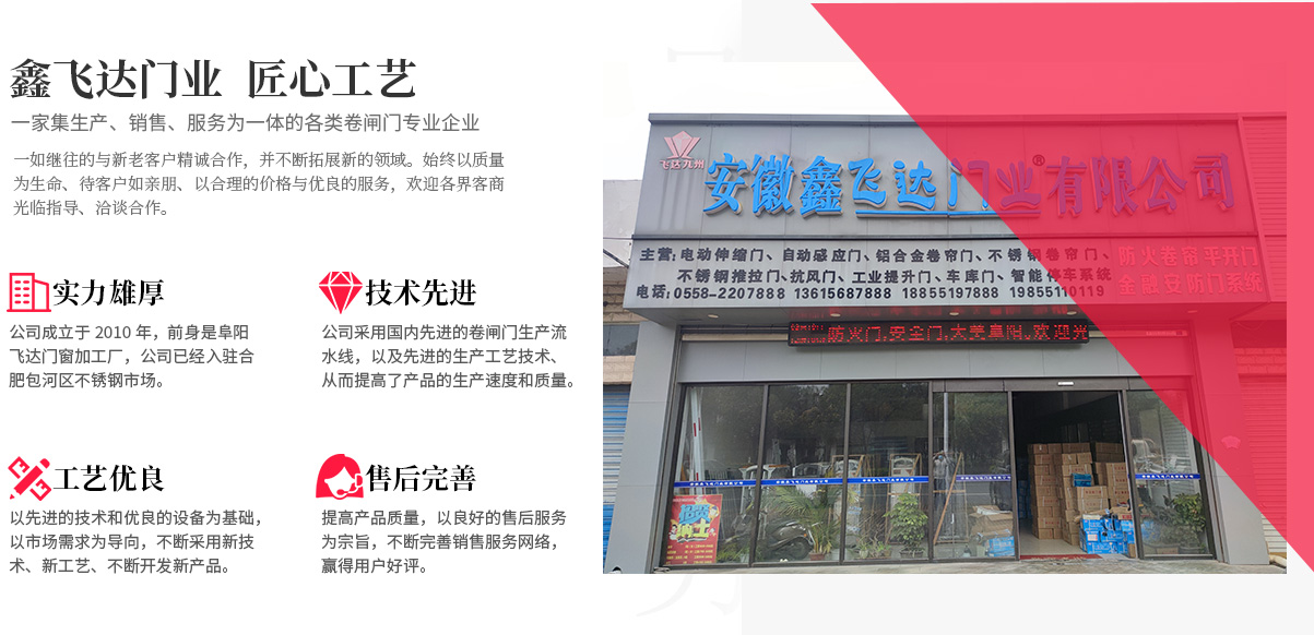 - 安徽鑫飛達門業(yè)有限公司成立于1998年,前身是阜陽飛達門窗加工廠,現(xiàn)在公司已經(jīng)入駐合肥包河區(qū)不銹鋼市場。本公司是一家集生產(chǎn)、銷售、服務為一體的各類卷閘門專業(yè)企業(yè)。公司采用國內(nèi)先進的卷閘門生產(chǎn)流水線,以及先進的生產(chǎn)工藝技術(shù)、從而提高了產(chǎn)品的生產(chǎn)速度和質(zhì)量。旗下?lián)碛酗w達九州和飛達門業(yè)兩個注冊商標。 產(chǎn)品種類齊全 ,質(zhì)量可靠,主要有不銹鋼推拉門,防火卷簾門,電動卷...